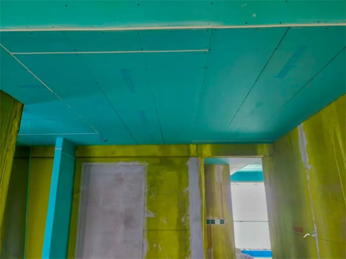 △吊頂平梁,梁下過(guò)一層石膏板,厚度10mm,縫隙用發(fā)泡膠軟連接,所有石膏均要求切割平直,陽(yáng)角不允許用石膏板原邊,合格。