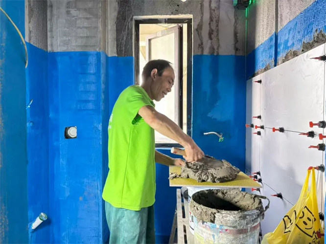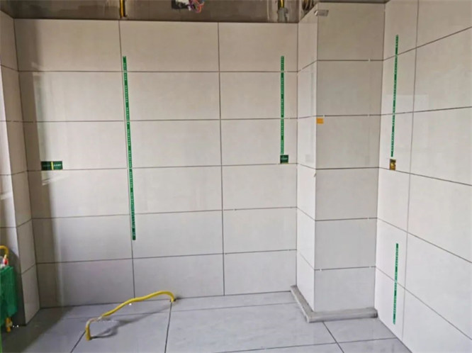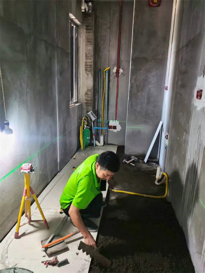我們的瓦工師傅會先用水平儀測量一下地面是否平整。